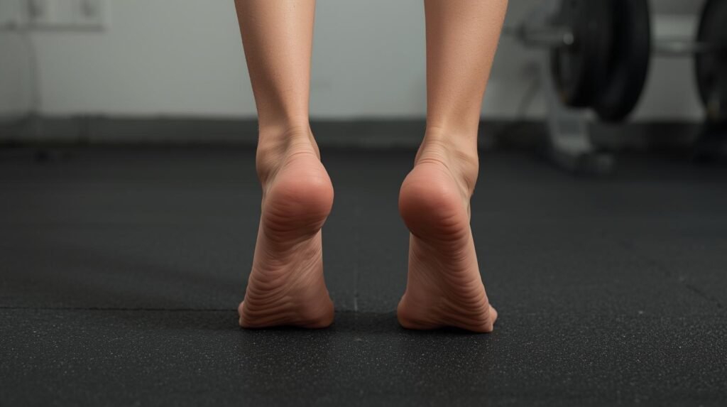 Sitting all day slows blood circulation. Calf raises wake up your legs and boost energy.
